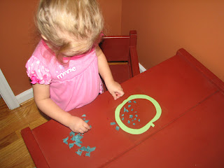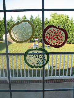 We decided to make Apple Sun Catchers. The apple template can be found here. I cut each apple out of construction paper, added contact paper to one side, then had Izzie add the tissue paper. After she was done, I added contact paper over the tissue paper. Yep, it's that easy!